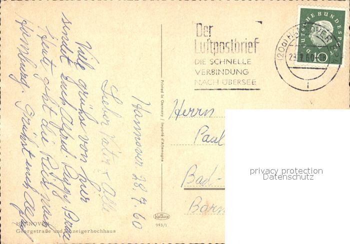 72406948 alte Postkarte HANNOVER CITY Georgstrasse Anzeigerhochhaus Strassenbahn postalisch gelaufen Erhaltung siehe scans KatCode: 11110003241001