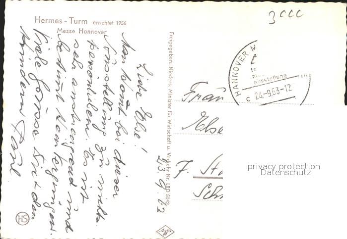 41598563 HANNOVER CITY Hermes Turm Messegelaende Fliegeraufnahme postalisch gelaufen Erhaltung siehe scans Alte Ansichtskarte Postkarte alte Postkarte hz_F Katcode 11110003241001