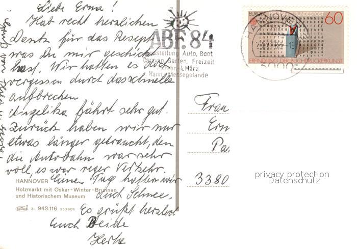 73061701 alte Postkarte HANNOVER CITY Holzmarkt mit Oskar Winter Brunnen und Hist Museum postalisch gelaufen Erhaltung siehe scans [WerneD78] KatCode: 11110003241001