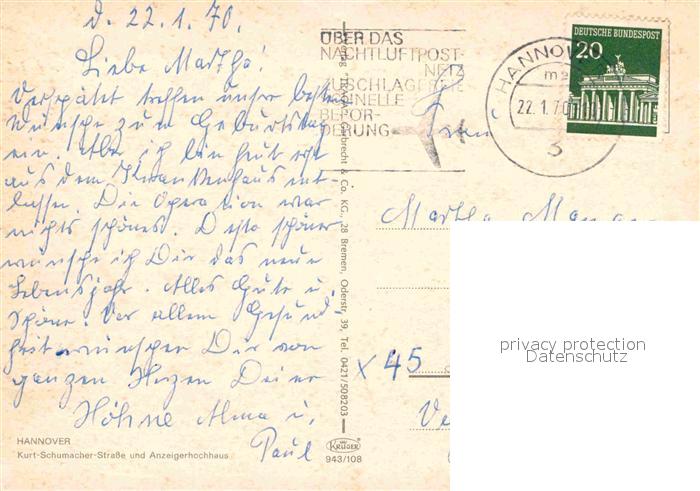 72822120 alte Postkarte HANNOVER CITY Kurt Schumacher Strasse Anzeigerhochhaus postalisch gelaufen Erhaltung siehe scans [LiesaD40] KatCode: 11110003241001