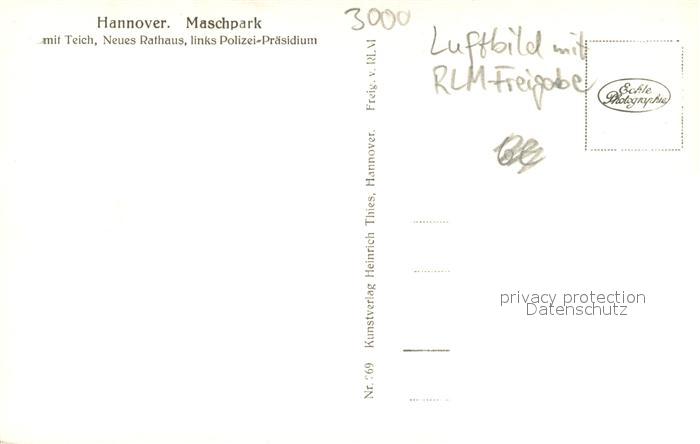73690405 HANNOVER CITY Maschpark mit Teich Neues Rathaus Polizei Praesidium Fliegeraufnahme postalisch nicht gelaufen Erhaltung siehe scans [WerneD78] Wern Katcode 11110003241001