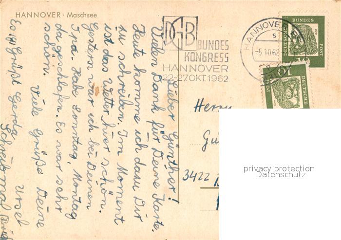 73064600 alte Postkarte HANNOVER CITY Maschsee postalisch gelaufen Erhaltung siehe scans [FriedD77] KatCode: 11110003241001