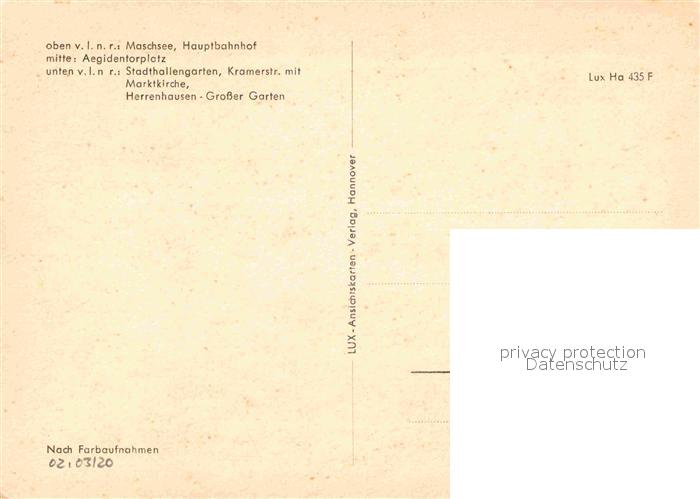 72908054 HANNOVER CITY Maschsee Hauptbahnhof Aegidentorplatz Stadthallengarten Marktkirche postalisch nicht gelaufen Erhaltung siehe scans [NatalD47] KatCode: 11110003241001