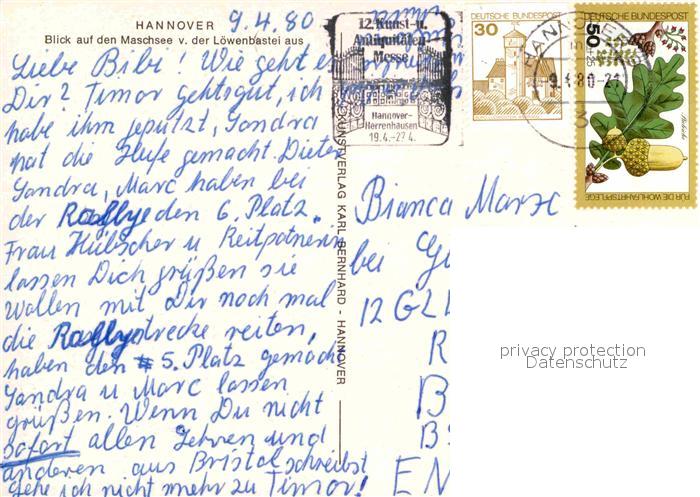 72887552 alte Postkarte HANNOVER CITY Maschsee Loewenbastei postalisch gelaufen Erhaltung siehe scans [WerneD78] KatCode: 11110003241001