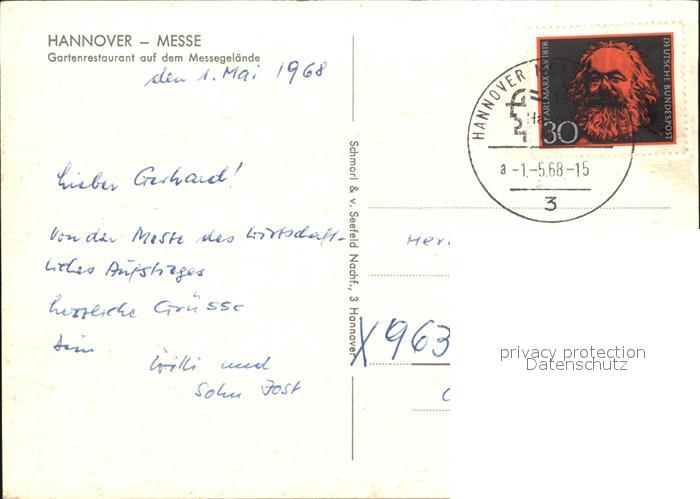 72455157 alte Postkarte HANNOVER CITY Messegelaende Gartenrestaurant postalisch gelaufen Erhaltung siehe scans KatCode: 11110003241001