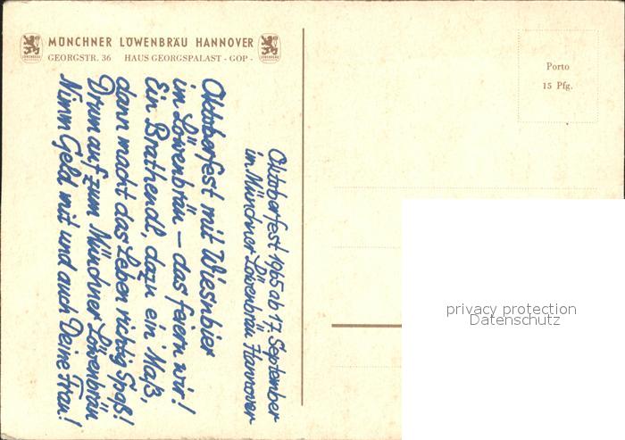 72139607 alte Postkarte HANNOVER CITY Muenchener Loewenbraeu Gastraum postalisch gelaufen Erhaltung siehe scans KatCode: 11110003241001