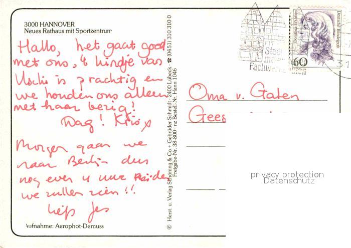 72772745 alte Postkarte HANNOVER CITY Neues Rathaus mit Sportzentrum Fliegeraufnahme postalisch gelaufen Erhaltung siehe scans [WerneD78] KatCode: 11110003241001