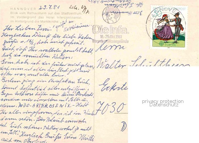 72838503 alte Postkarte HANNOVER CITY Panorama Blick vom Rathausturm Stadtzentrum Hotel Intercontinental Marktkirche postalisch gelaufen Erhaltung siehe scans [FriedD77] KatCode: 11110003241001