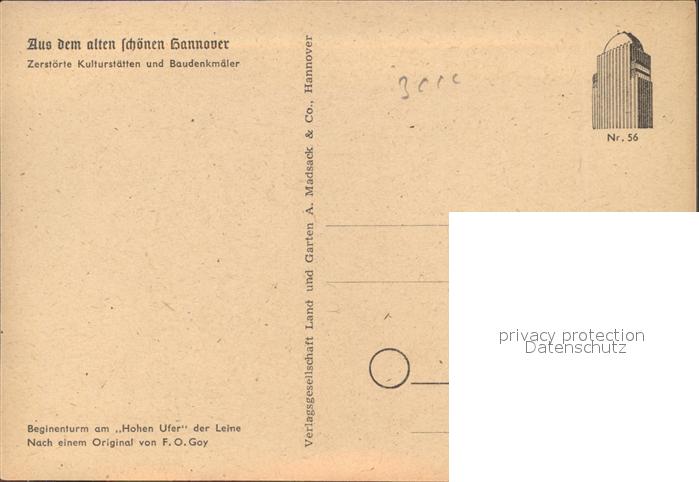41598774 HANNOVER CITY Zerstoerte Kulturstaetten Baudenkmaeler Beginenturm am Hohen Ufer Leine Kuenstlerkarte F. O. Goy Nr. 56 postalisch nicht gelaufen Erhaltung siehe scans Alte Ansichtskarte Postkarte hz_F Katcode 11110003241001
