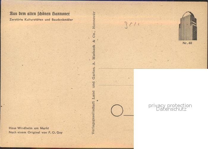 41598770 HANNOVER CITY Zerstoerte Kulturstaetten Baudenkmaeler Haus Windheim am Markt Kuenstlerkarte F. O. Goy Nr. 60 postalisch nicht gelaufen Erhaltung siehe scans Alte Ansichtskarte Postkarte hz_F Katcode 11110003241001