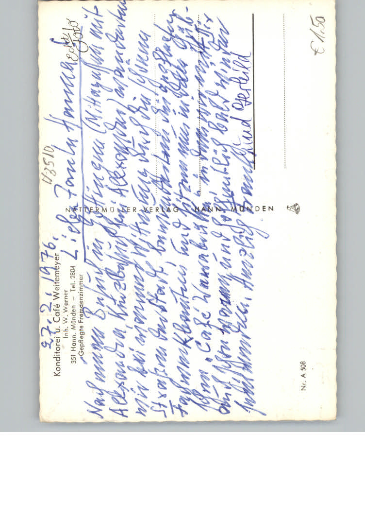 31131980 Hannoversch Muenden Konditorei – Cafe Weitemeyer postalisch nicht gelaufen KatCode: 11110003152016