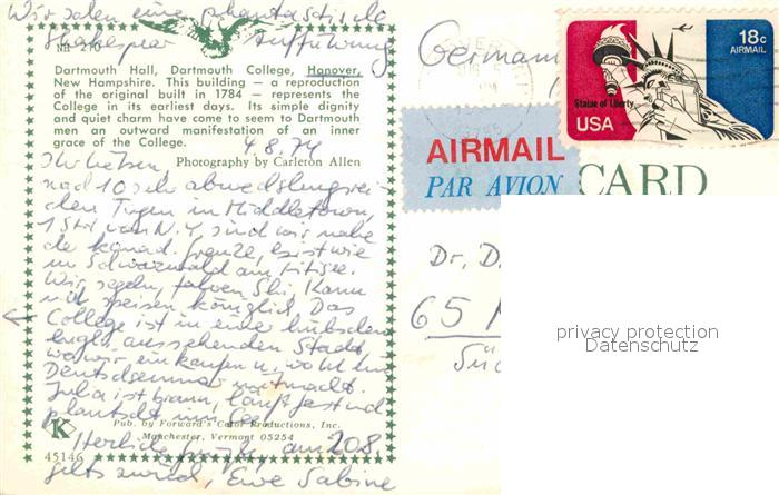 72794119 old postcard Hanover New Hampshire Dortmouth Hall College postalisch gelaufen Erhaltung siehe scans [LiesaD40] KatCode: 14140310000000