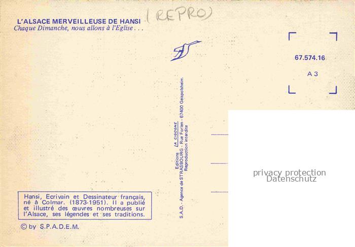 74023522 Hansi Waltz J J Kuenstlerkarte Alsace Elsass Chaque Dimanche nous allons Eglis postalisch nicht gelaufen Reprokarte Erhaltung siehe scans [IrynaD87] KatCode: 22240000001800