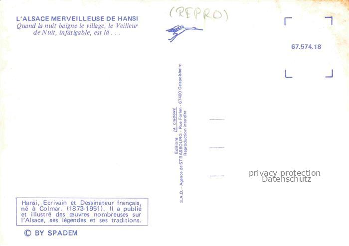 74022220 Hansi Waltz J J Kuenstlerkarte Alsace Elsass Quand la nuit baigne le village le Veilleur Nuit postalisch nicht gelaufen Reprokarte Erhaltung siehe scans [IrynaD87] KatCode: 22240000001800