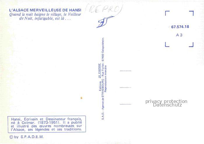 74023526 Hansi Waltz J J Kuenstlerkarte Alsace Elsass Quand la nuit baigne le village Veilleur Nuit infatigable postalisch nicht gelaufen Reprokarte Erhaltung siehe scans [IrynaD87] KatCode: 22240000001800
