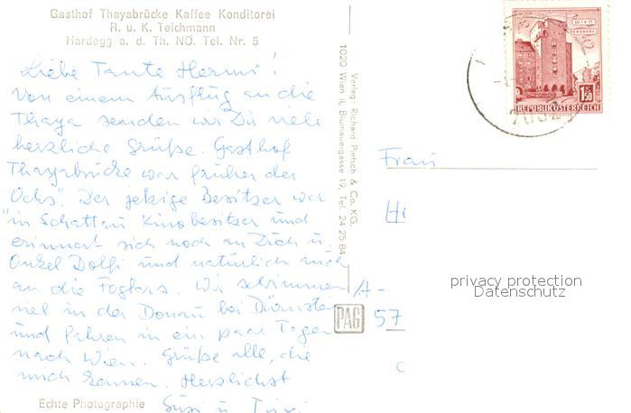 73143555 alte Postkarte Hardegg Gasthof Teichmann postalisch gelaufen Erhaltung siehe scans [NatalD47] KatCode: 11390125031016
