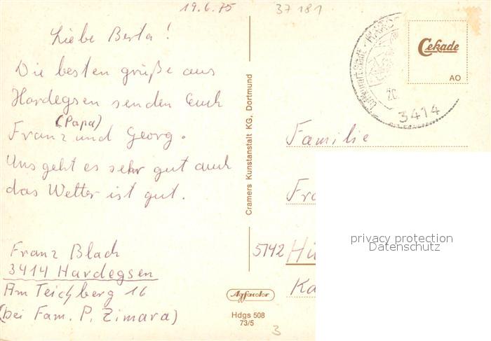 73673664 alte Postkarte Hardegsen Fliegeraufnahme Stadtpark Wildpark Domaene Stubenstrasse Rathaus postalisch gelaufen Erhaltung siehe scans [WerneD78] KatCode: 11110003155005