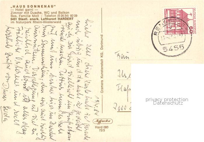 73641793 alte Postkarte Hardert Hotel garni Haus Sonnenau Luftkurort Naturpark Rhein Westerwald postalisch gelaufen Erhaltung siehe scans [FriedD77] KatCode: 11110007138026