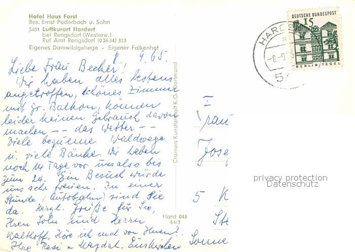 72804885 alte Postkarte Hardert Hotel Haus Forst Garten postalisch gelaufen Erhaltung siehe scans [FriedD77] KatCode: 11110007138026