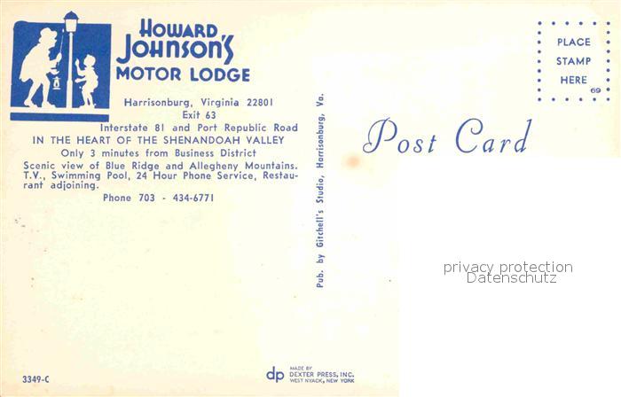 72891677 Harrisonburg Virginia Howard Johnsons Motor Lodge postalisch nicht gelaufen Erhaltung siehe scans [LiesaD40] KatCode: 14140490000000