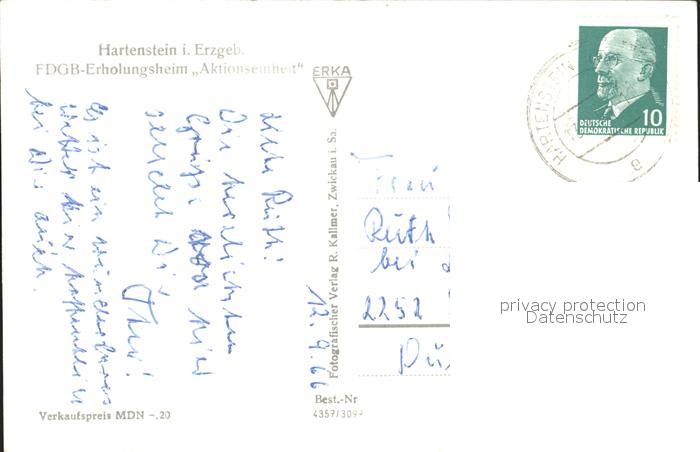 72113504 alte Postkarte Hartenstein Zwickau FDGB Erholungsheim Aktionseinheit postalisch gelaufen Erhaltung siehe scans KatCode: 11110014193130