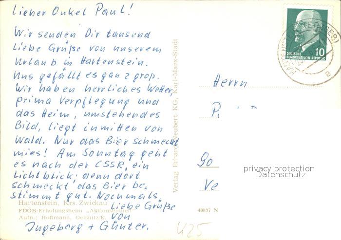 72077041 alte Postkarte Hartenstein Zwickau FDGB Erholungsheim Aktionseinheit postalisch gelaufen KatCode: 11110014193130
