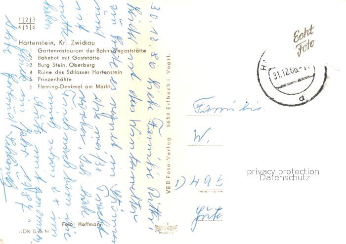 73036571 alte Postkarte Hartenstein Zwickau Gartenrestaurant Bahnhofsgaststaette Bahnhof Burg Stein Ruine Schloss postalisch gelaufen Erhaltung siehe scans [KathaD81] KatCode: 11110014193130