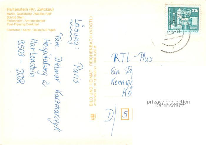 73654426 alte Postkarte Hartenstein Zwickau Markt Gaststaette Weisses Ross Schloss Stein Ferienheim Aktionseinheit Paul Fleming Denkmal postalisch gelaufen Erhaltung siehe scans [WerneD78] KatCode: 11110014193130