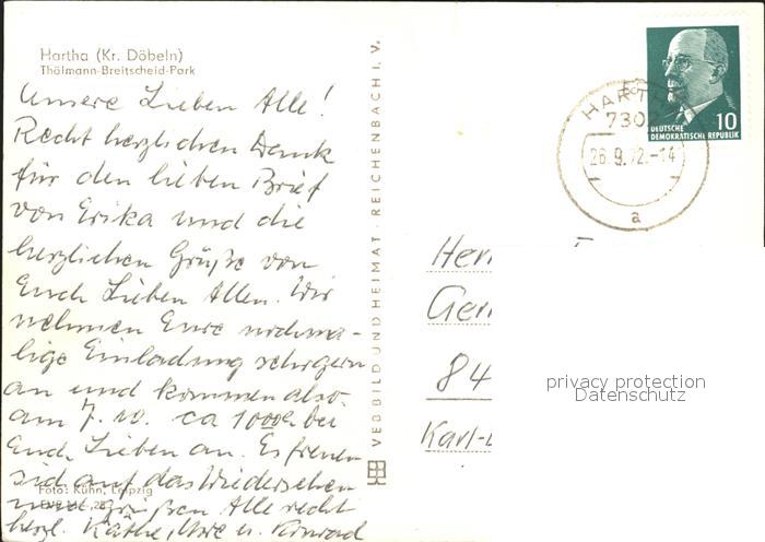 72328428 alte Postkarte Hartha Doebeln Thaelmann Breitscheid- Park postalisch gelaufen Erhaltung siehe scans KatCode: 11110014375070
