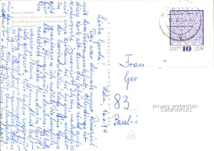 72000771 alte Postkarte Hartha Tharandt Betriebsferienheim Waldschaenke VEB Bunt Samtweberei Seifhennersdorf postalisch gelaufen Erhaltung siehe scans KatCode: 11110014290440