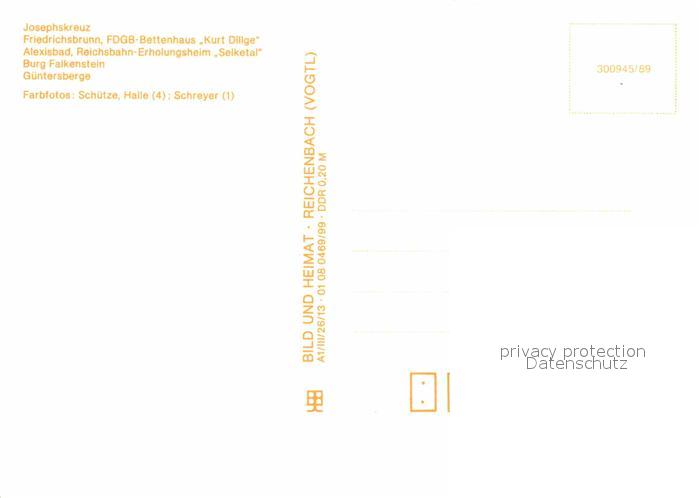 72628502 Harz Region Josephskreuz Friedrichsbrunn FDGB Bettenhaus Kurt Dillge Alexisbad Reichsbahn Erholungsheim Selketal Burg Falkenstein Guentersberge postalisch nicht gelaufen Erhaltung siehe scans [WerneD78] KatCode: 11110015085145