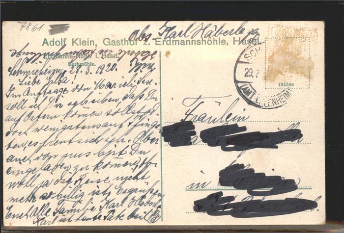 71370026 alte Postkarte Hasel Baden Hasler Hoehle BW Erdmannshoehle postalisch gelaufen KatCode: 11110008336034
