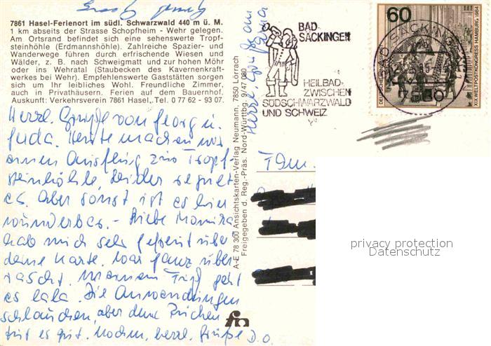72722138 alte Postkarte Hasel Baden Hasler Hoehle BW Ferienort suedlicher Schwarzwald Fliegeraufnahme postalisch gelaufen Erhaltung siehe scans [FriedD77] KatCode: 11110008336034