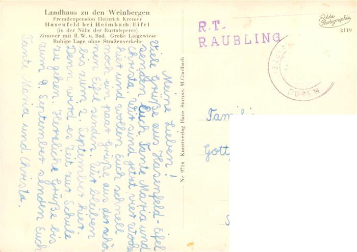 73878007 alte Postkarte Hasenfeld Heimbach Landhaus zu den Weinbergen Gastraum Garten postalisch gelaufen Erhaltung siehe scans [FriedD77] KatCode: 11110005358012