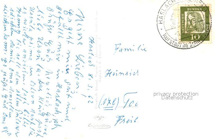 73332656 alte Postkarte Haslach Kinzigtal Gesamtansicht Rathaus Kirche Schwarzwaldhaus Wasserfall Schwimmbad Storche postalisch gelaufen Erhaltung siehe scans [FriedD77] KatCode: 11110008317040