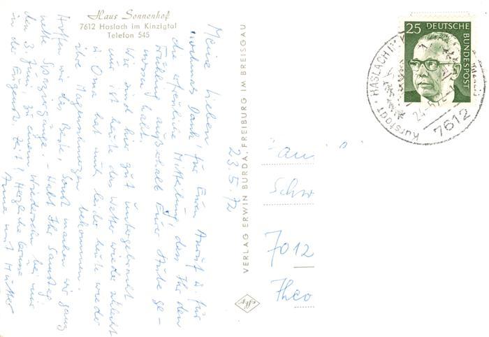 73876539 alte Postkarte Haslach Kinzigtal Haus Sonnenhof Hotel Garnie Gastraeume Zimmer Terrasse Garten postalisch gelaufen Erhaltung siehe scans [FriedD77] KatCode: 11110008317040