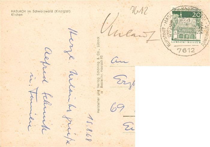 73928956 alte Postkarte Haslach Kinzigtal Kirchen postalisch gelaufen Erhaltung siehe scans [FriedD77] KatCode: 11110008317040