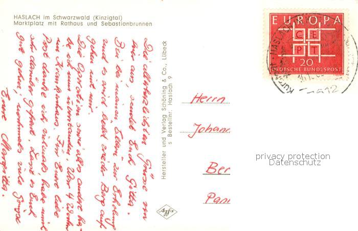 73644216 alte Postkarte Haslach Kinzigtal Marktplatz Rathaus Sebastianbrunnen postalisch gelaufen Erhaltung siehe scans [FriedD77] KatCode: 11110008317040