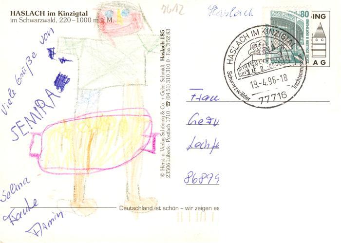 73934964 alte Postkarte Haslach Kinzigtal Storchen Teilansicht Rathaus Freibad Lagnyplatz Bauernfamilie Trachtenmuseum Marktplatz postalisch gelaufen Erhaltung siehe scans [WerneD78] KatCode: 11110008317040