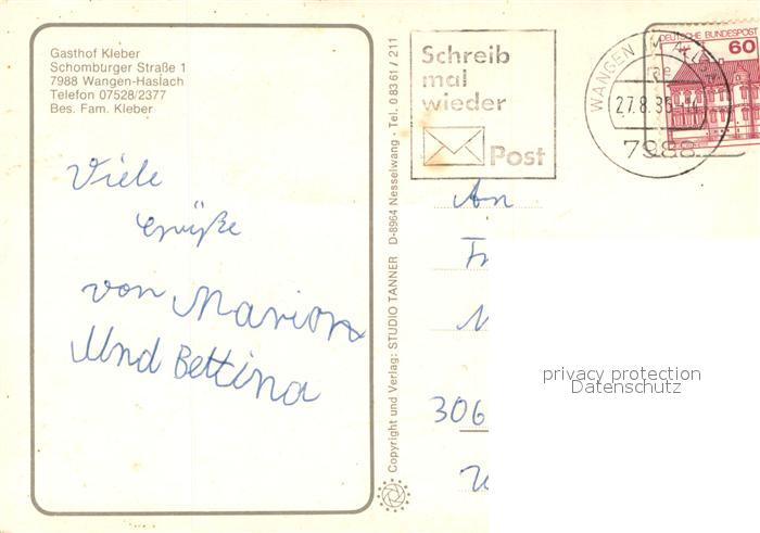 73704617 alte Postkarte Haslach Wangen Allgaeu Gasthof Kleber Restaurant Festsaal postalisch gelaufen Erhaltung siehe scans [FriedD77] KatCode: 11110008436081