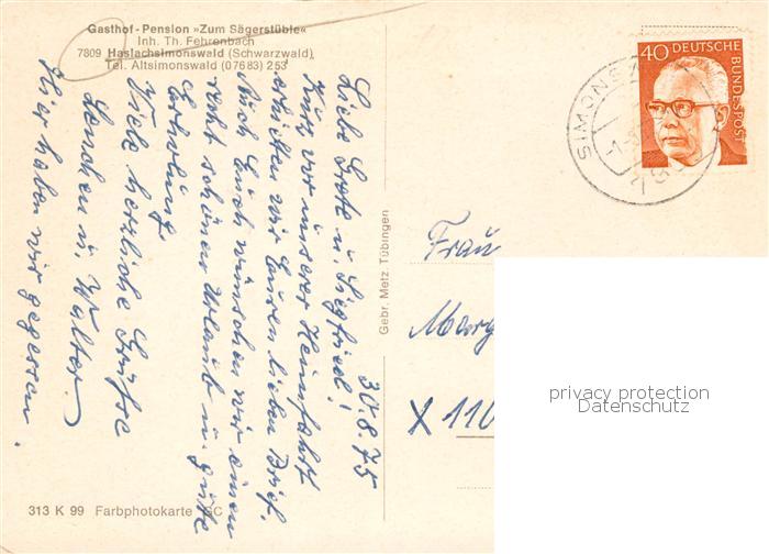 73863346 alte Postkarte Haslachsimonswald Gasthof Pension zum Saegerstueble postalisch gelaufen Erhaltung siehe scans [FriedD77] KatCode: 11110008316042