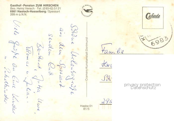 73720356 alte Postkarte Hasselberg Main Gasthof Pension Zum Hirschen Gaststube Kinderspielplatz postalisch gelaufen Erhaltung siehe scans [FriedD77] KatCode: 11110009677137