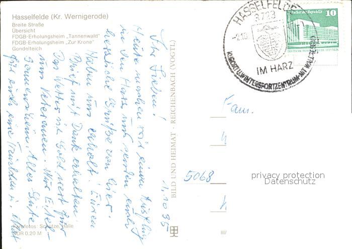 72459764 alte Postkarte Hasselfelde Breite Str Panorama FDGB Erholungsheime Tannenwald und Zur Krone Gondelteich postalisch gelaufen Erhaltung siehe scans KatCode: 11110015085150
