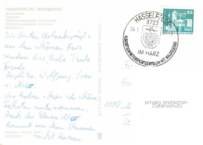72913702 alte Postkarte Hasselfelde Breite Strasse Erholungsheime Tannenwald Zur Krone Gondelteich postalisch gelaufen Erhaltung siehe scans [LiesaD40] KatCode: 11110015085150