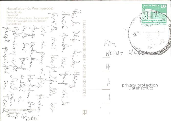 72136056 alte Postkarte Hasselfelde Breite Strasse uebersicht FDGB Erholungsheim Gondelteich postalisch gelaufen Erhaltung siehe scans KatCode: 11110015085150