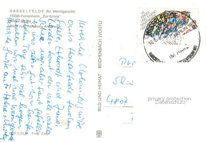 73046164 alte Postkarte Hasselfelde FDGB Ferienheim Zur Krone Breite Strasse Rathaus Markt postalisch gelaufen Erhaltung siehe scans [KathaD81] KatCode: 11110015085150
