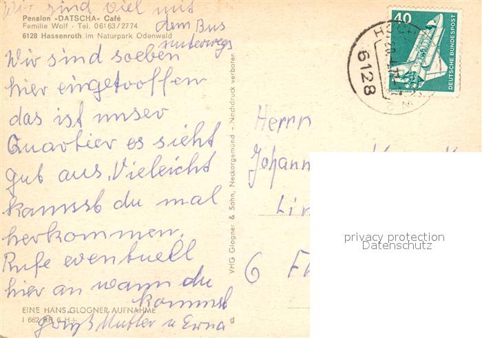 73082844 alte Postkarte Hassenroth Pension Datscha Cafe Landschaftspanorama Naturpark Odenwald postalisch gelaufen Erhaltung siehe scans [FriedD77] KatCode: 11110006437009