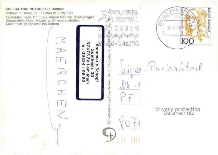 74054942 alte Postkarte Hassfurt Main Bayern Kreiskrankenhaus Fliegeraufnahme postalisch gelaufen Erhaltung siehe scans [WerneD78] KatCode: 11110009674147
