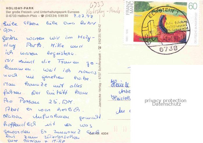 74006117 alte Postkarte Hassloch Pfalz Holiday-Park Freizeit- und Unterhaltungspark postalisch gelaufen Erhaltung siehe scans [FriedD77] KatCode: 11110007332025