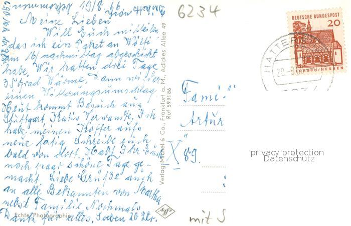 73706650 alte Postkarte Hattersheim Main Schule Sarotti AG Kath Kirche Schwarzbachbruecke mit hl Nepomuk Rathaus postalisch gelaufen Erhaltung siehe scans [WerneD78] KatCode: 11110006436005